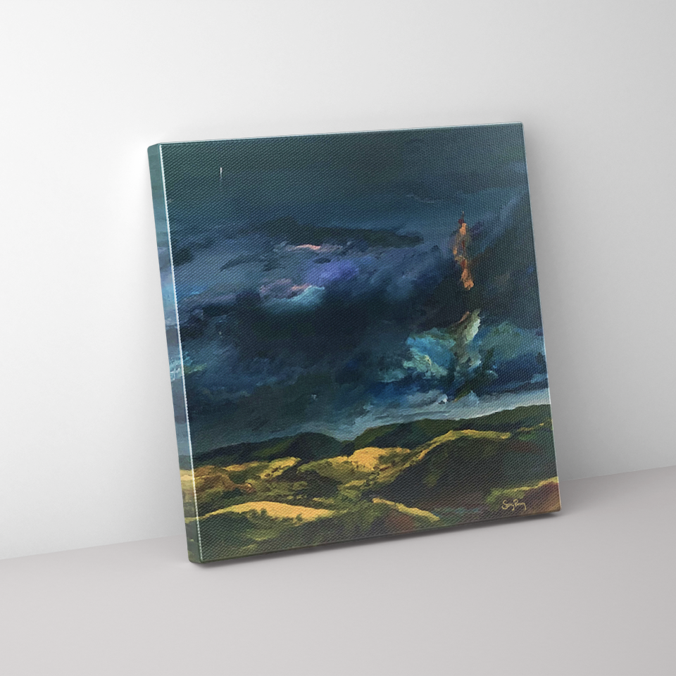 Bring the raw, cinematic energy of a Texas thunderstorm into your space with this museum-quality canvas print of Scotty Pulley’s original oil painting. “Storms Over Texas Hill Country” captures the moment dark clouds churn above golden ridges, lit by a bolt of atmospheric brilliance. Vivid blues, deep violets, and sun-washed ochres collide in this dynamic celebration of land and sky.